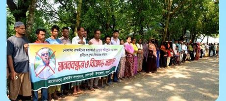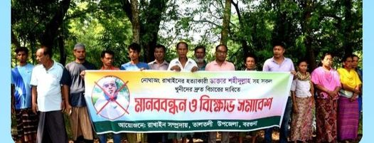 বরগুনার তালতলীতে রাখাইন মি: নোথা অং হত্যা মামলার আসামি শহিদুল ডাক্তার সহ সকল খুনিদের দ্রুত বিচারের দাবিতে মানববন্ধন ও বিক্ষোভ সমাবেশ করেছে উপজাতী রাখাইন জনগোষ্ঠীর সদস্যরাসহ স্থানীয় বাঙ্গালীরা। শনিবার(২৮অক্টোবর) সকাল ১০ টায় তালতলী উপজেলার তাঁতীপাড়া বাজারে এই মানববন্ধন ও বিক্ষোভ সমাবেশ অনুষ্ঠিত হয়েছে। বিক্ষোভ সমাবেশে বক্তব্য রাখেন নোথা অং হত্যা মামলার বাদী জোওয়েন জয়, রাখাইন সমাজ উন্নয়ন সংস্থার সাধারণ সম্পাদক মংচিন থান,নামিশে পাড়া বৌদ্ধ বিহারের সাবেক সভাপতি মি:খেচিং মং,বাংলাদেশ রাখাইন স্টুডেন্ট ইউনিটি সাধারণ সম্পাদক মি: মং থান চো, সমাজ সেবক মি: জোওয়েন বক্তারা বলেন, নোথা অং কে জমির জন্য নৃশিংসভাবে হত্যা করা হয়েছে।এই হত্যা মামলার বয়স ৬ বছর হলেও আজ পর্যন্ত সিআইডি চুরান্ত প্রতিবেদন দেয়নি। এই মামলার অন্যতম আসামী শহিদুল ডাক্তার জামিনে বেড়িয়ে আমাদের বিভিন্ন ভাবে ভয়ভীতি দেখাচ্ছে। সমাবেশে বক্তারা আরো বলেন, রাখাইন সম্প্রদায়ের ভ‚মি গ্রাস করার জন্য দীর্ঘদিন ধরে এলাকার একটি প্রভাবশালী মহল রাখাইন সম্প্রদায়ের সদস্যদের হত্যা-সহ নানাভাবে হয়রানি ও নির্যাতন করে তাঁদের জমি থেকে বিতাড়িত করছে। রাখাইনদের সমাধি ও ফসলি জমি জাল-জালিয়াতি করে দখল করে নিচ্ছে। ফলে নিঃস্ব অনেক আদিবাসী রাখাইন সদস্য পরিবার নিয়ে নীরবে দেশ ছেড়েছেন। এখনো যাঁরা পিতৃভিটা আঁকড়ে আছেন,তাঁরাও চরম নিরাপত্তাহীনতার মধ্যে আছেন। নোথা অংয়ের এই হত্যাকান্ডের পর রাখাইনদের মধ্যে আতঙ্ক বিরাজ করছে। শহীদুল ডাক্তার সহ এই হত্যা মামলার আসামিদের গ্রেফতার করা হলেও জামিনে বের হয়ে শহিদুল ডাক্তার গংরা আবারও রাখাইনদের জমি দখলের পায়তারা চালাচ্ছে । এই হত্যা মামলার আসামিদের দ্রুত সাজা ঘোষণা না হলে আদিবাসীদের সম্পত্তি ও জীবনের নিরাপত্তা বিধান করা অসম্ভব। গত ২০১৭ সালের ২২ জুন তালতলী উপজেলার নামিশেপাড়া থেকে রাখাইন বৃদ্ধ নোথা অংয়ের গলাকাটা লাশ উদ্ধার করে তালতলী থানার পুলিশ। ঘটনার দুইদিন পর ২৪ জুন তাঁর আত্মীয় জোওয়েন বাদী হয়ে চারজনের নাম উল্লেখ করে ও কয়েকজনকে অজ্ঞাতনামা আসামি করে তালতলী থানায় একটি হত্যা মামলা করেন। এ মামলায় সিআইডি পুলিশ অজানা কারণে ৬ বছর পার হলেও সিআইডি পুলিশ এখনো চুরান্ত প্রতিবেদন দেয়নি। তাই আমাদের দাবী দ্রুত পুলিশ প্রতিবেদন আদালতে দিয়ে আসামীদের কঠোর শাস্তির দাবী জানাচ্ছি।